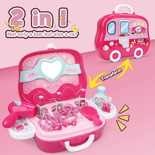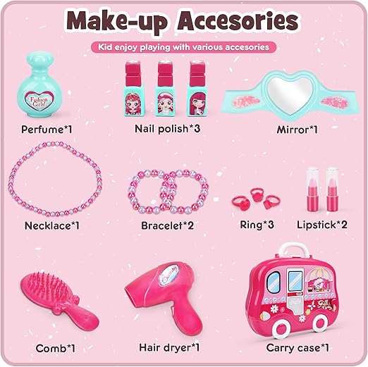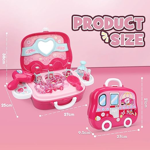 This role play jewelry kit comes in a portable pink suitcase, perfect for imaginative pretend play. The set includes 19 accessories such as a mirror, combs, hair dryer, and more, allowing kids to enjoy creative dress-up activities while developing imagination and role play skills. Made from safe, non-toxic plastic with smooth edges, it is durable and child-friendly. Lightweight and compact, the suitcase makes it easy to carry and store after playtime.