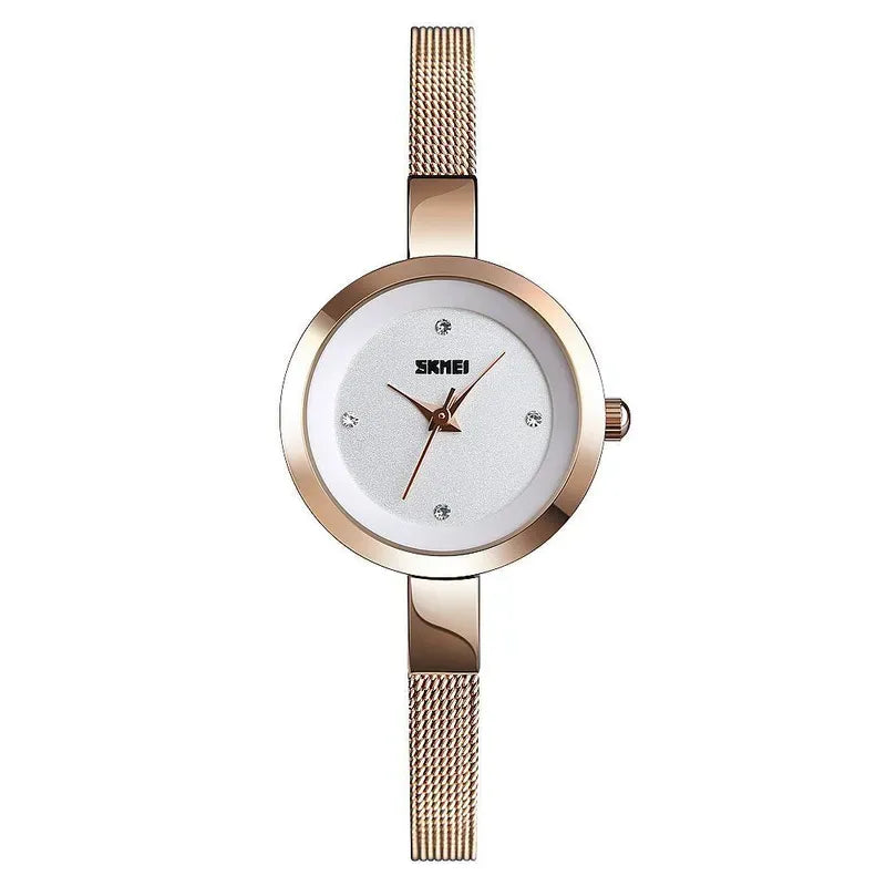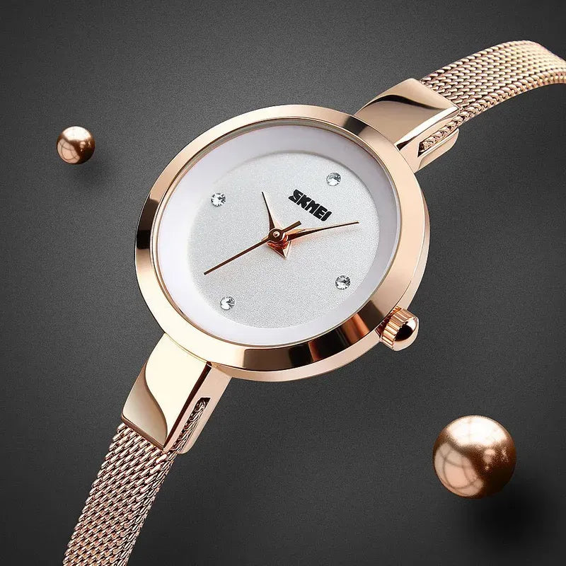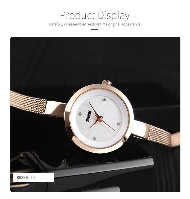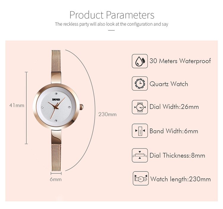 Brand Name: SKMEI Item Type: Luxury Ladies Quartz Wristwatches Water Resistance: 3ATM (Not suitable for swimming,shower,etc) Case Shape: Round Case Thickness: 8mm Dial Diameter: 26mm Feature: Water Resistant Band Length: 23cm Clasp Type: Bracelet Clasp Case Material: Alloy Movement: Quartz Gender: Women Band Width: 6mm Movement type: Quartz Movement |