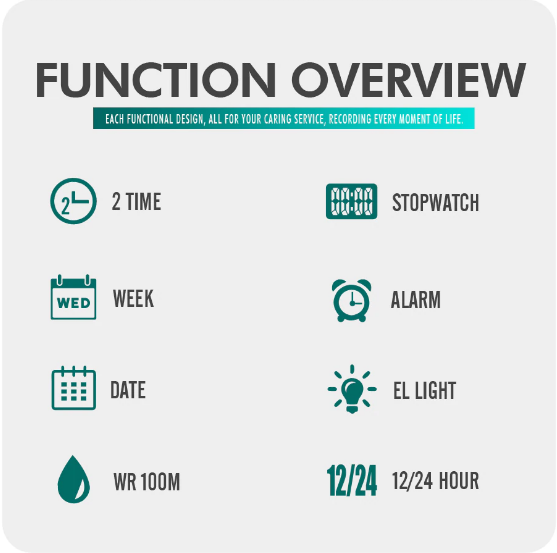 Feature:Water Resistant,Two Time,Alarm,Day, Date, Week, Month, Back Light,